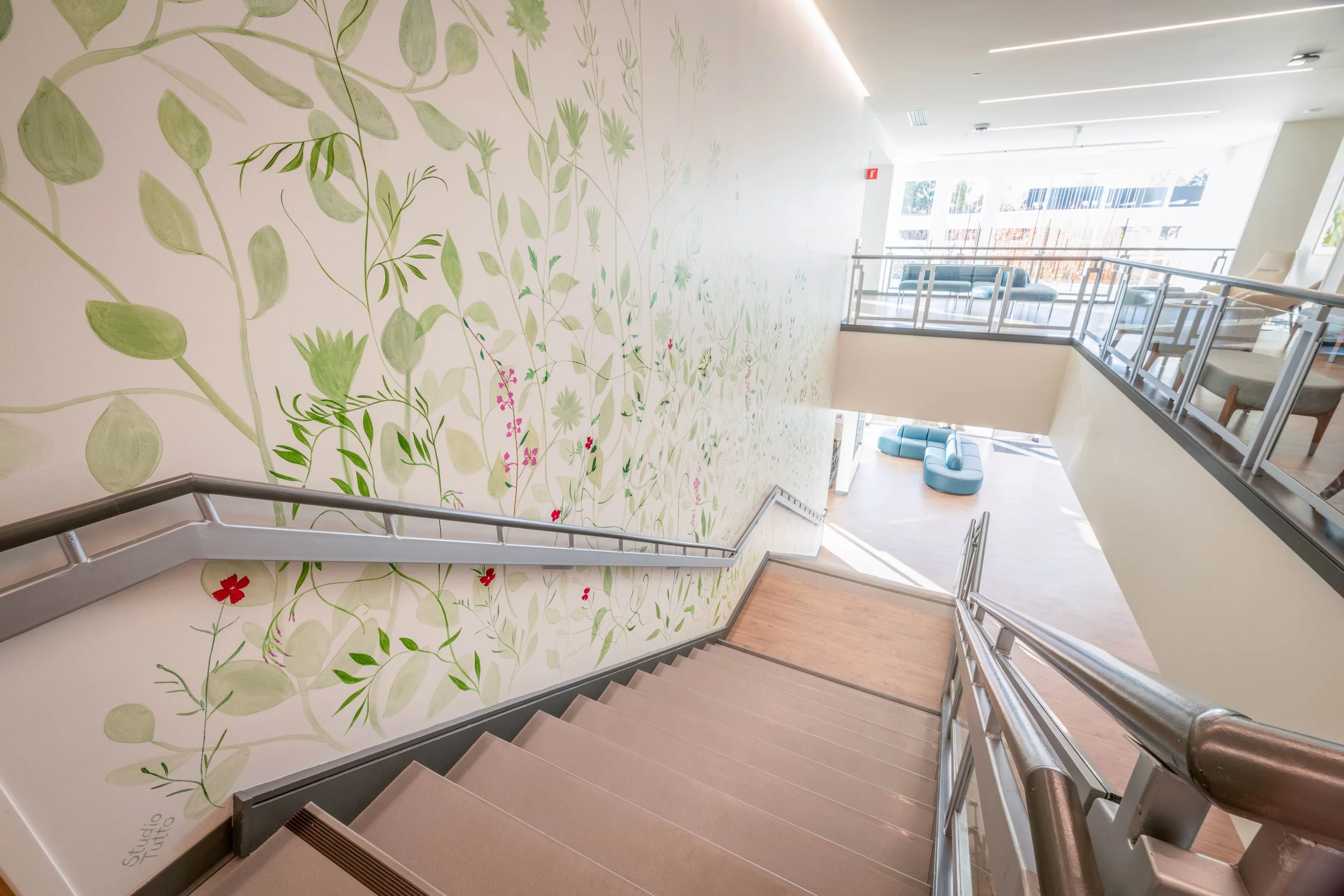Second floor view of the stairwell mural by Studio Tutto; original mixed media on panel by Jamie Madison.