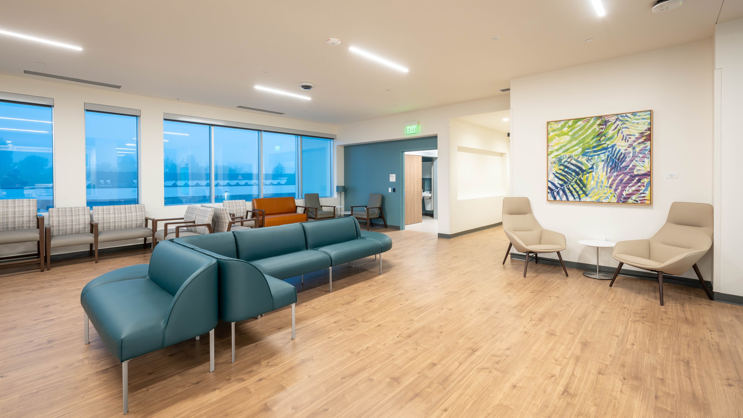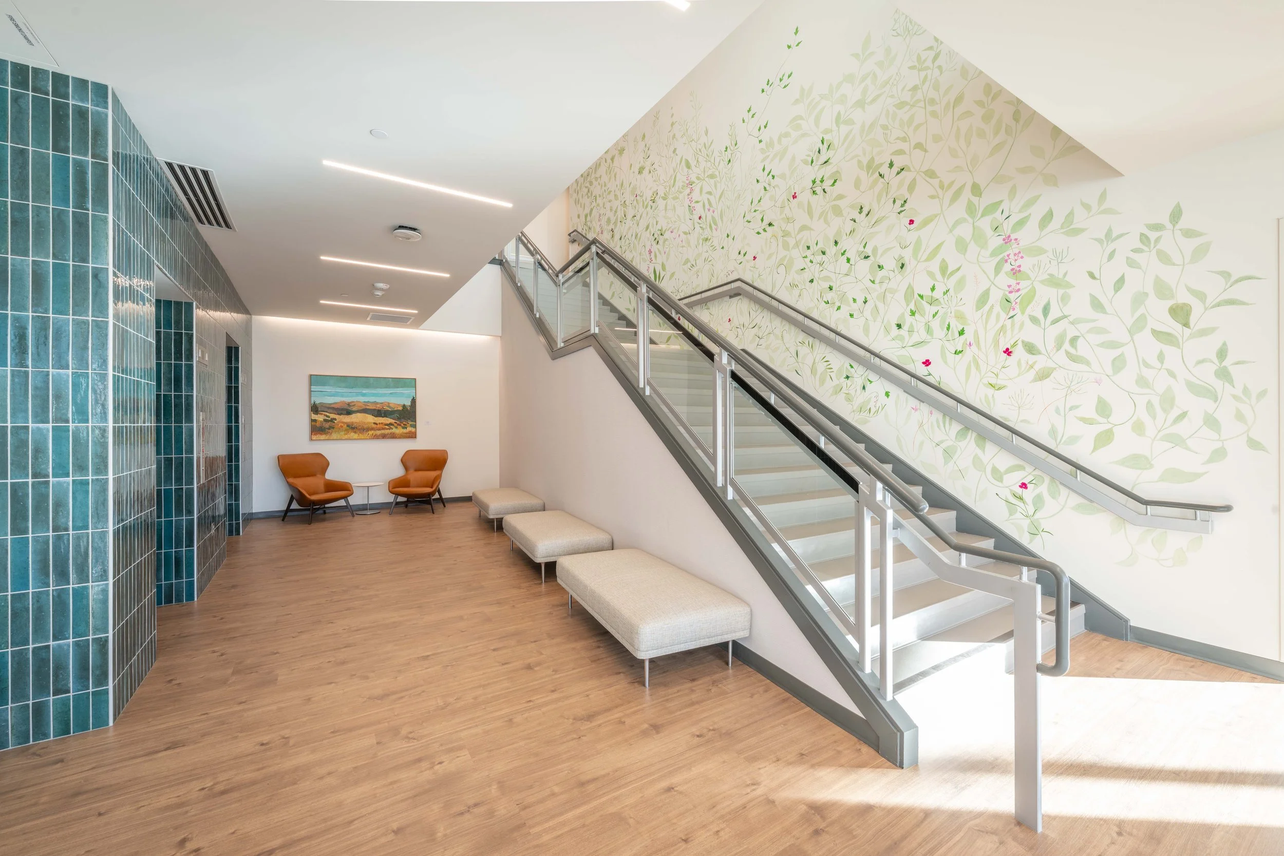 A 70,000 SF care center for Sutter Health designed by Taylor Design and built by S+B James with 260 pieces of artwork. Grigio collaborated closely with the design team and leadership to develop an artwork package that met the goals of Sutter Health’s new brand guide, which included three large gallery wall installations and a two-story stairwell mural. Grigio used elevations to design layouts and filtered through hundreds of images from local and regional artists to curate visually balanced gallery wall compositions across three separate walls - the first floor is the largest, with a 27’ inset wall holding twelve pieces. The two story mural greets visitors at the entrance of the building - a native botanical design that feels light and uplifting, drawing your eye up to the second floor. Other key art moments include two commissioned paintings and a large commissioned cyanotype triptych. Corridors also feature local artists, and each exam room holds a piece of local landscape photography.