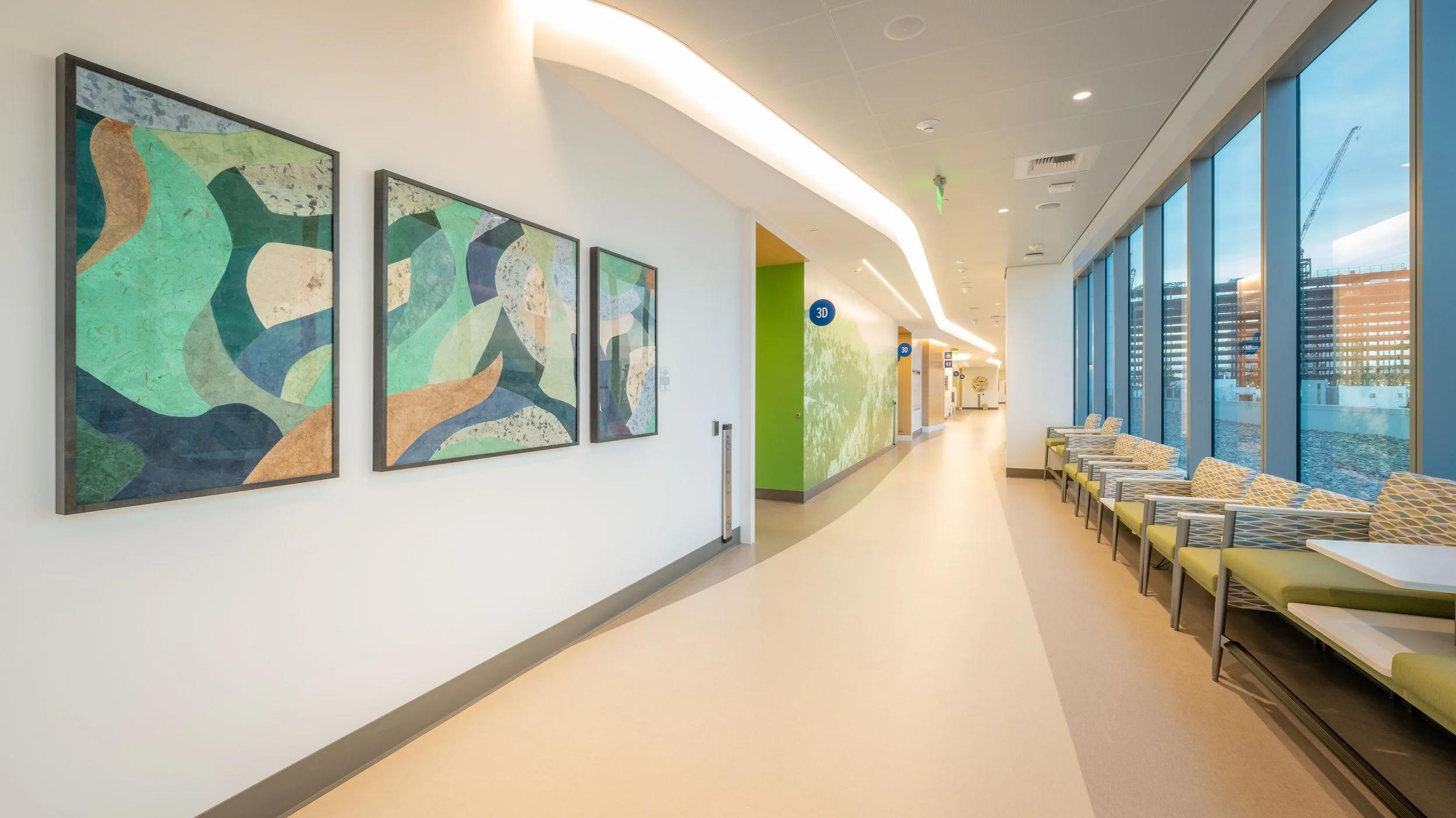 A 70,000 SF care center for Sutter Health designed by Taylor Design and built by S+B James with 260 pieces of artwork. Grigio collaborated closely with the design team and leadership to develop an artwork package that met the goals of Sutter Health’s new brand guide, which included three large gallery wall installations and a two-story stairwell mural. Grigio used elevations to design layouts and filtered through hundreds of images from local and regional artists to curate visually balanced gallery wall compositions across three separate walls - the first floor is the largest, with a 27’ inset wall holding twelve pieces. The two story mural greets visitors at the entrance of the building - a native botanical design that feels light and uplifting, drawing your eye up to the second floor. Other key art moments include two commissioned paintings and a large commissioned cyanotype triptych. Corridors also feature local artists, and each exam room holds a piece of local landscape photography.